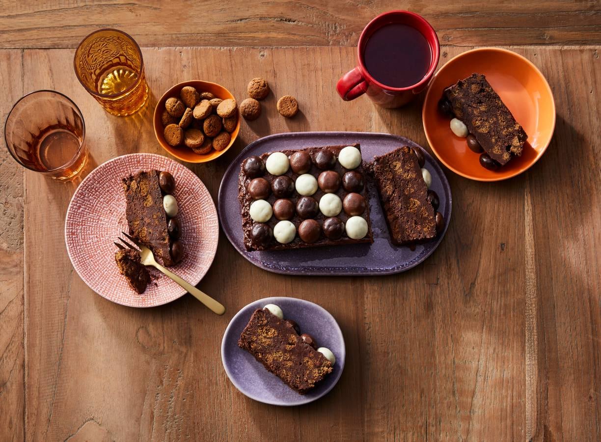 Doe de kruidnoten in een zip-lockzakje of schone theedoek. Verkruimel ze met een deegroller tot een mix van fijne en grove stukken. Meng de kruimels door het chocolademengsel. Verdeel het mengsel over een met bakpapier bekleed cakeblik en strijk glad.