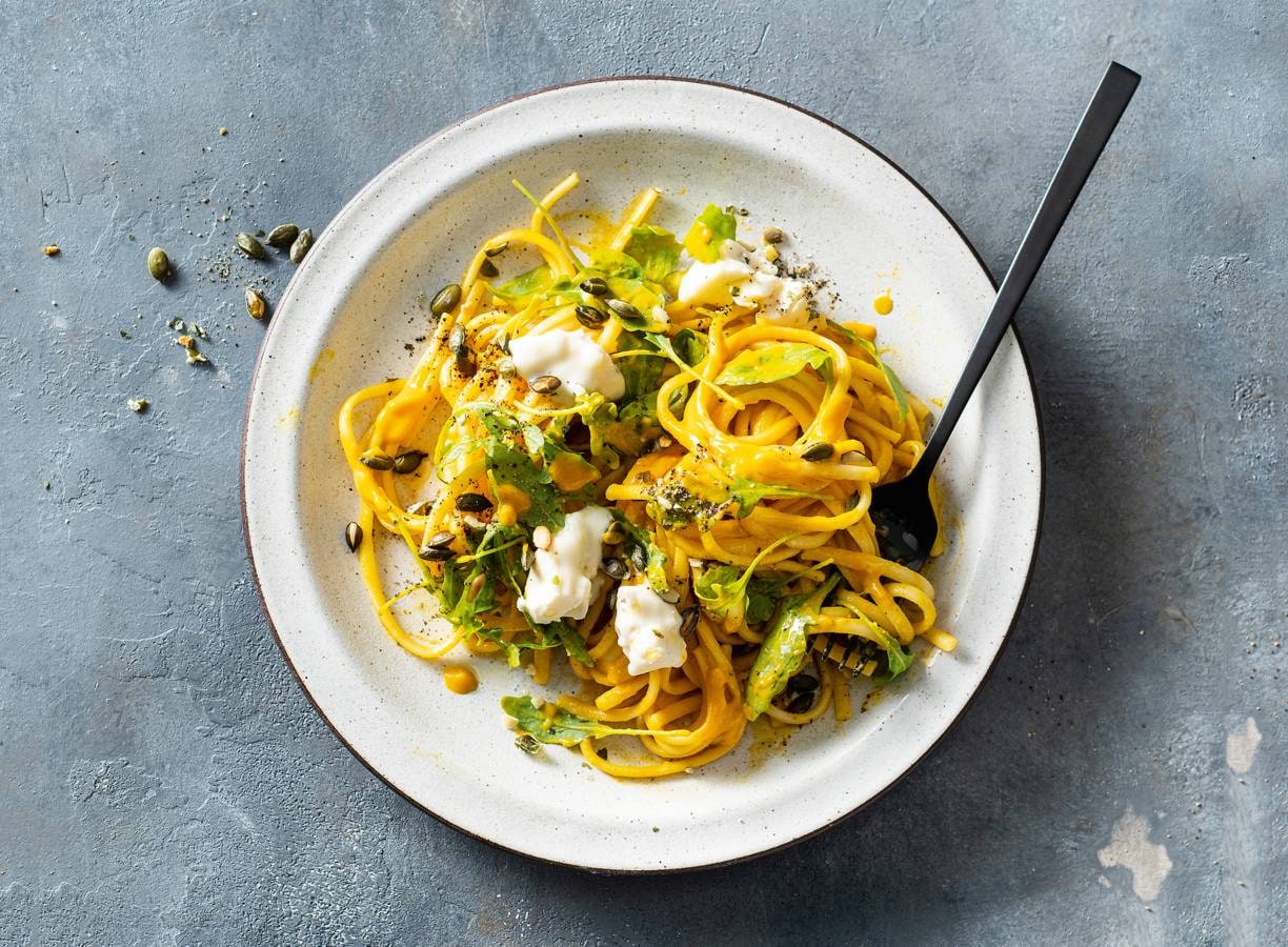 Meng de linguine met de pompoensaus. Schep de rucola erdoor. Verdeel over borden. Garneer met de pompoenpitten en de rest van de gormas.