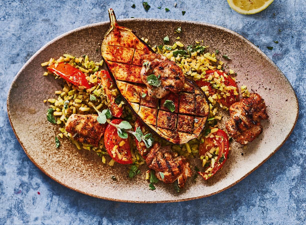 Geroosterde aubergine met broccolirijst, tomaat & gegrilde kip