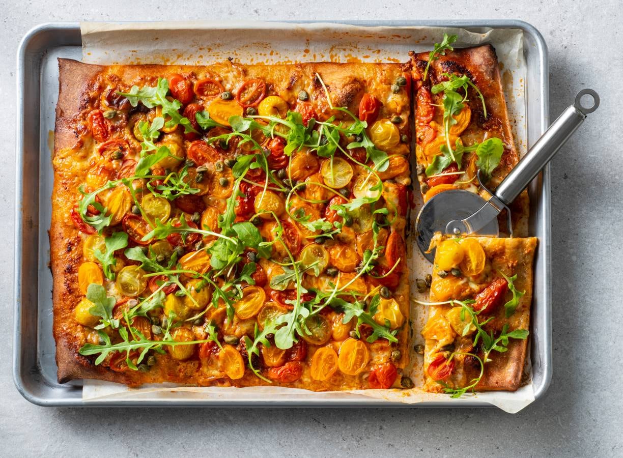 Volkorenpizza met mozzarella, kappertjes en snoeptomaatjes