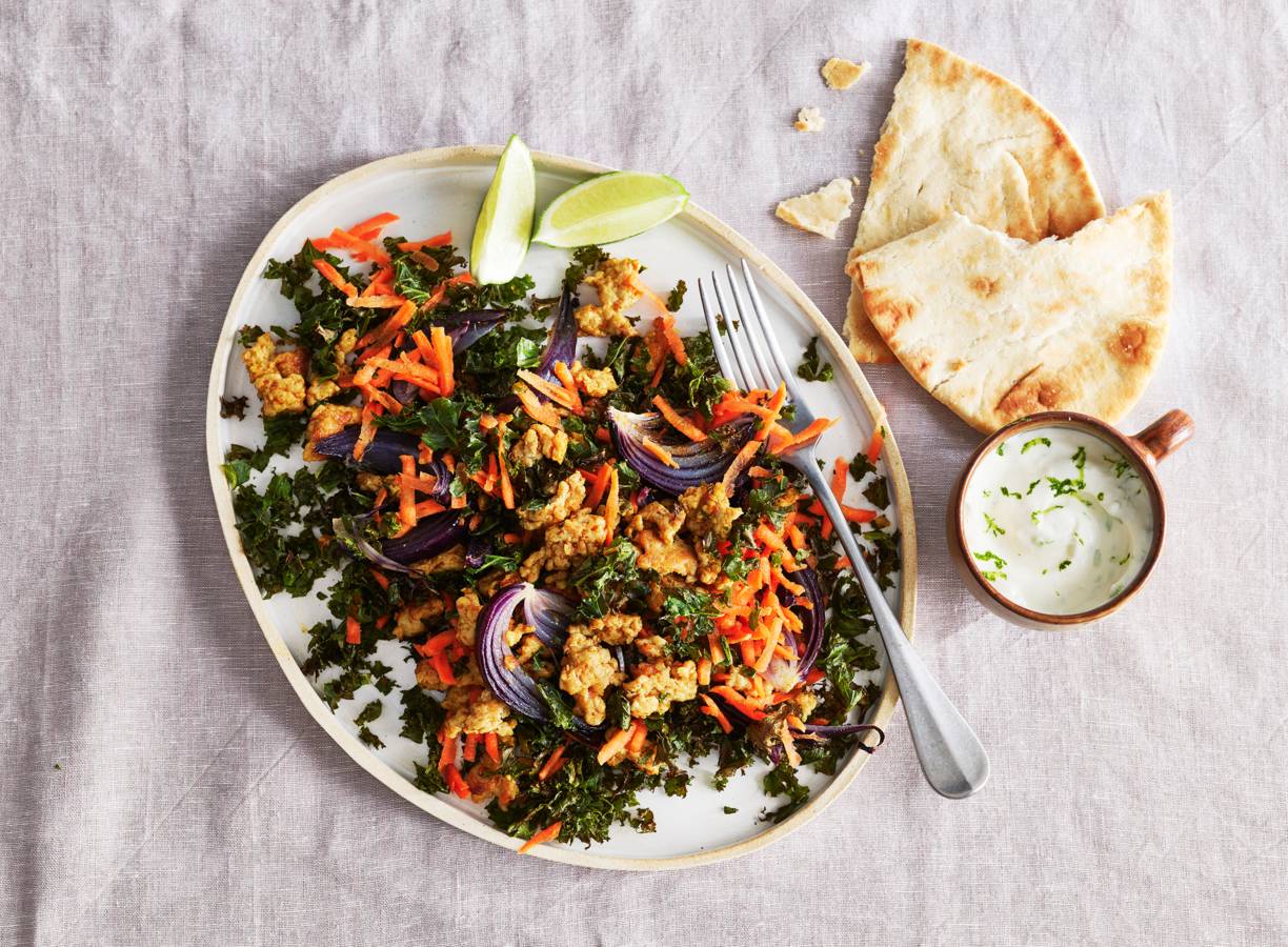 Meng de boerenkool met de geraspte peen en het kipgehakt. Serveer met de limoenyoghurt, de flatbreads en een limoenpartje.