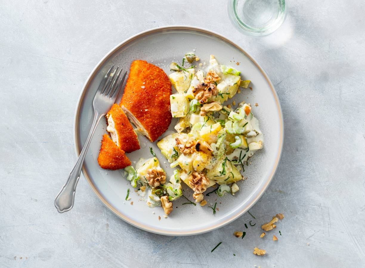 Cordon bleu met aardappel-selderijsalade & walnoten