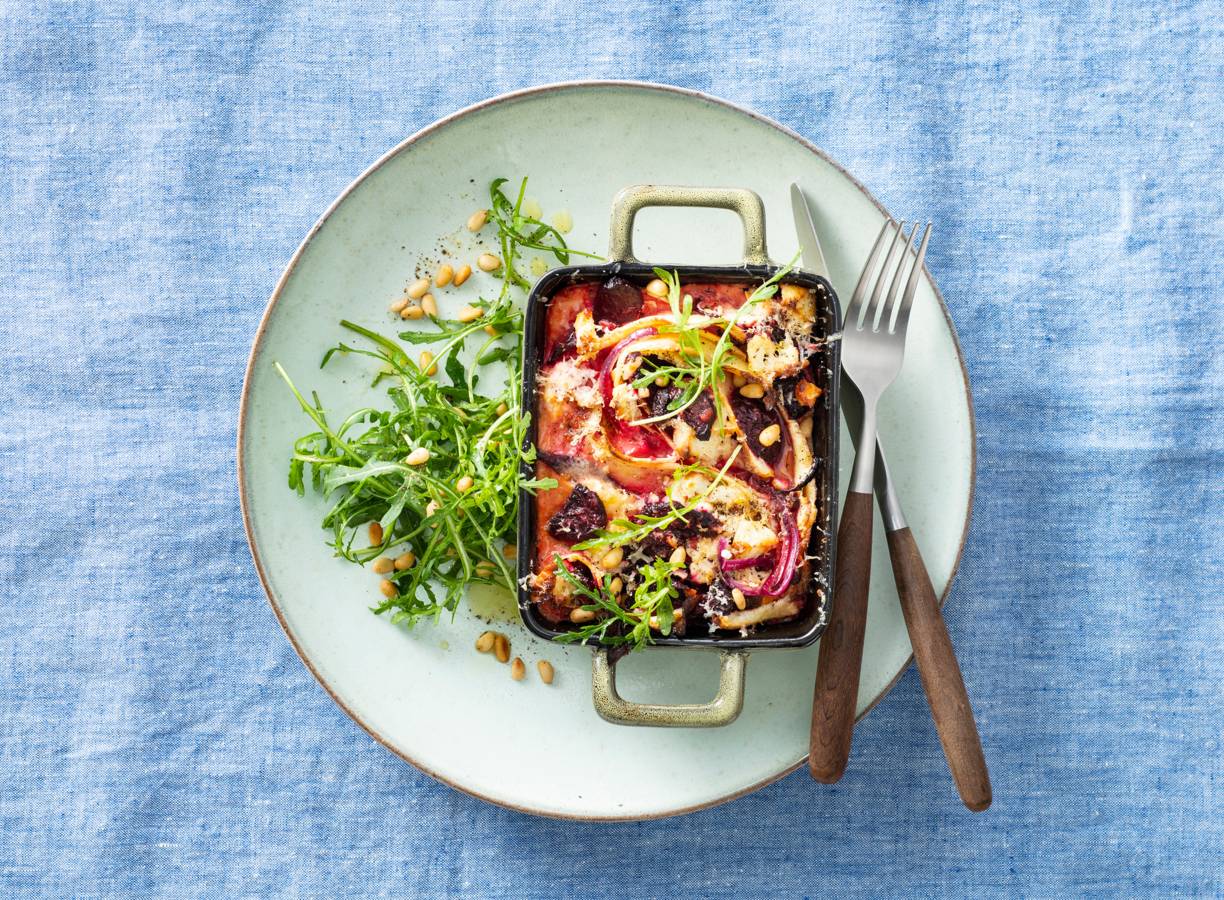 Bieten-geitenkaastaartjes met pastinaak & rucola