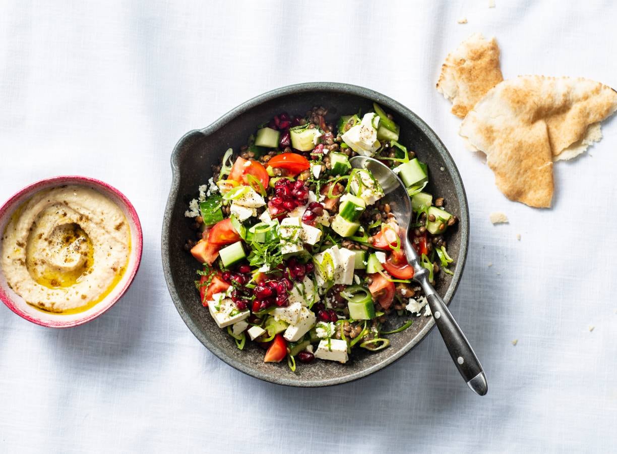 2. Meng de linzen met de komkommer, tomaten, bosui, munt en de dressing. Verkruimel de witte kaas erover en bestrooi met de granaatappelpitjes.