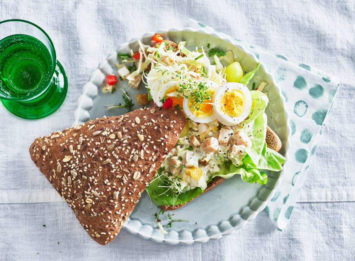 Snijd de broodjes open en beleg de onderste helften achtereenvolgens met de sla, kip-mangosalade, ei, rauwkost en tuinkers. Bestrooi met peper, leg de bovenste helften erop en serveer.