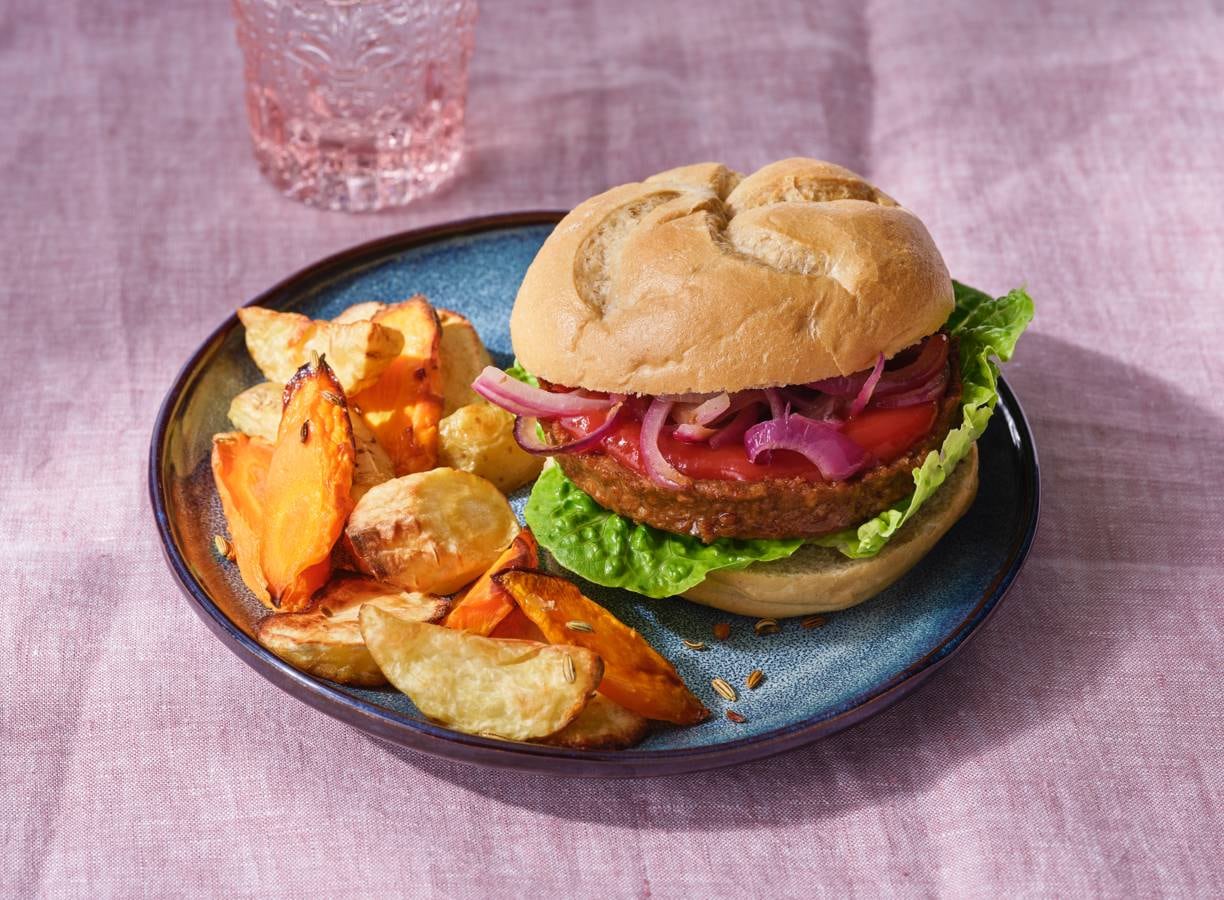 Vega burger met geroosterde wintergroenten