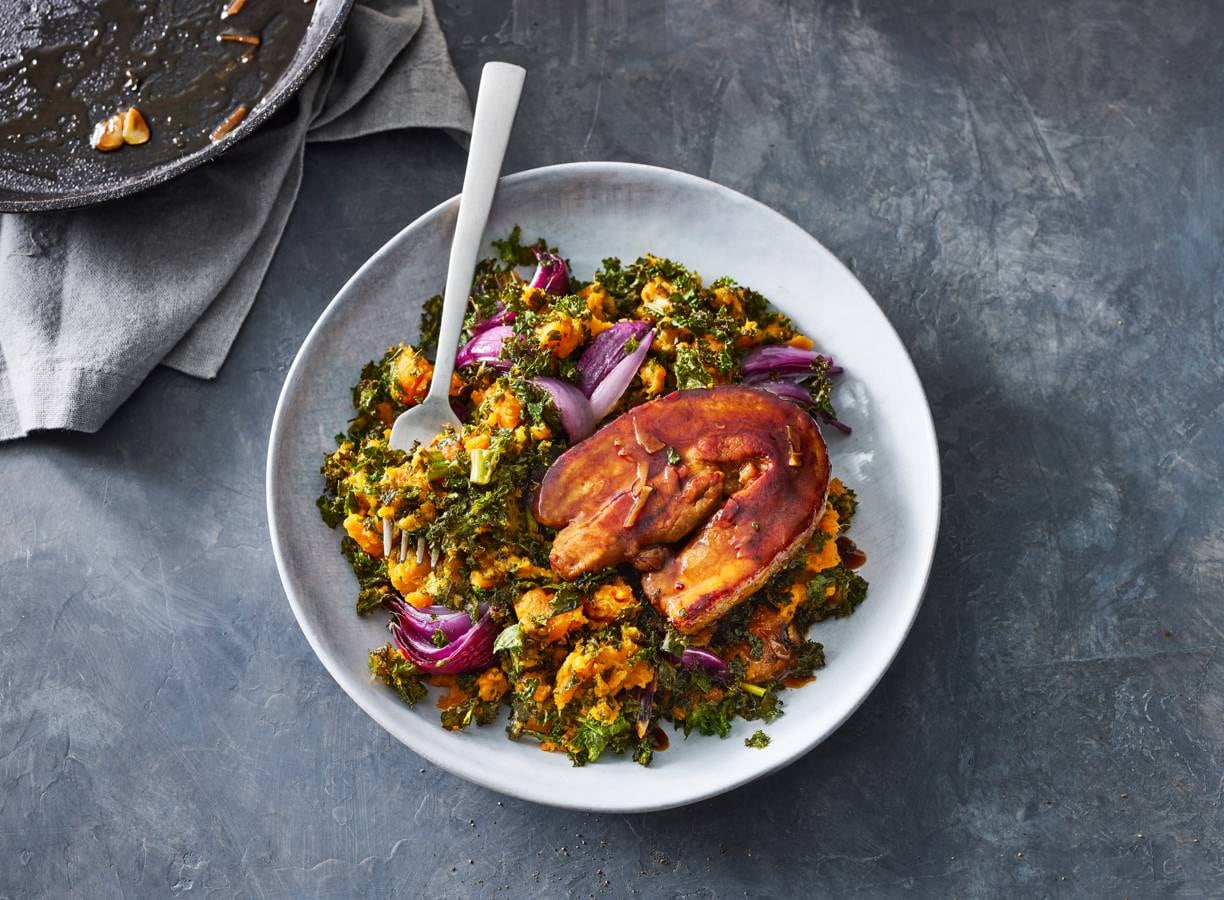Giet de zoete aardappelen af en stamp fijn met de pureestamper. Schep de helft van de boerenkool en de uien erdoor. Strooi de rest van de boerenkool en uien over de stamppot en serveer met de sticky speklapjes.