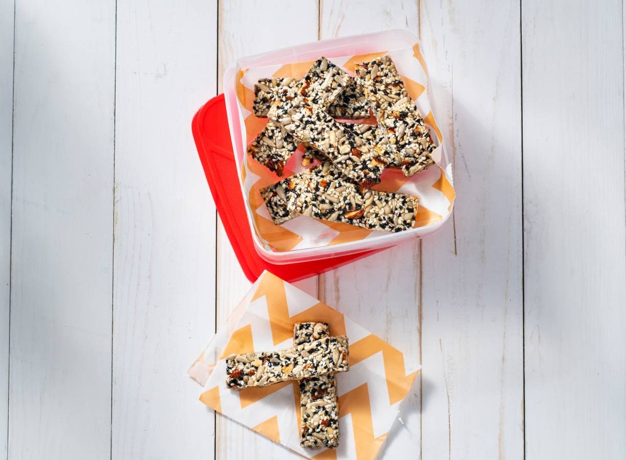 Bestrijd je middagdip met deze heerlijke snackrepen van sesam, honing, amandelen en zonnebloempitten.