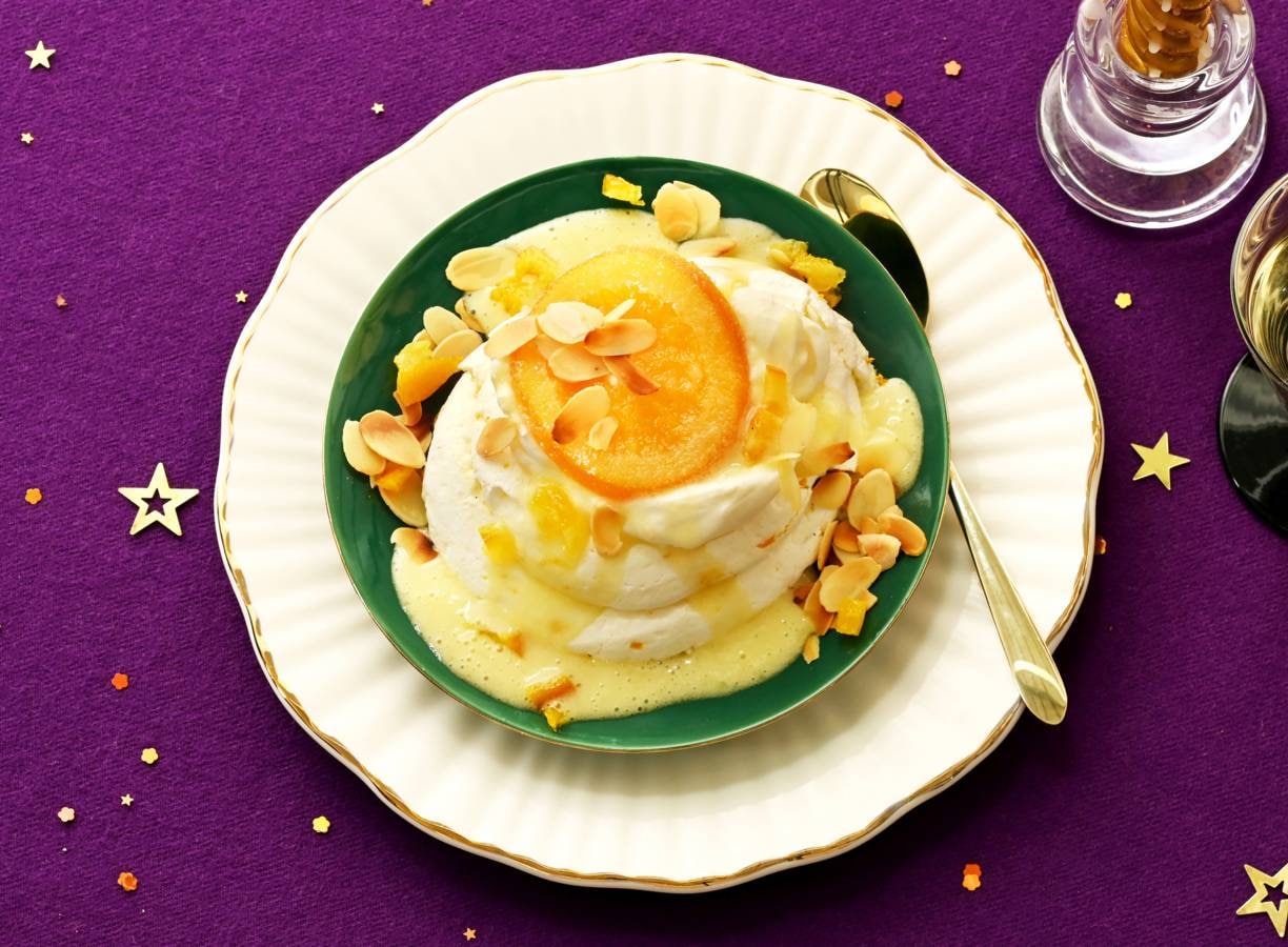 Sinaasappelmeringues met laurierroom en amandel