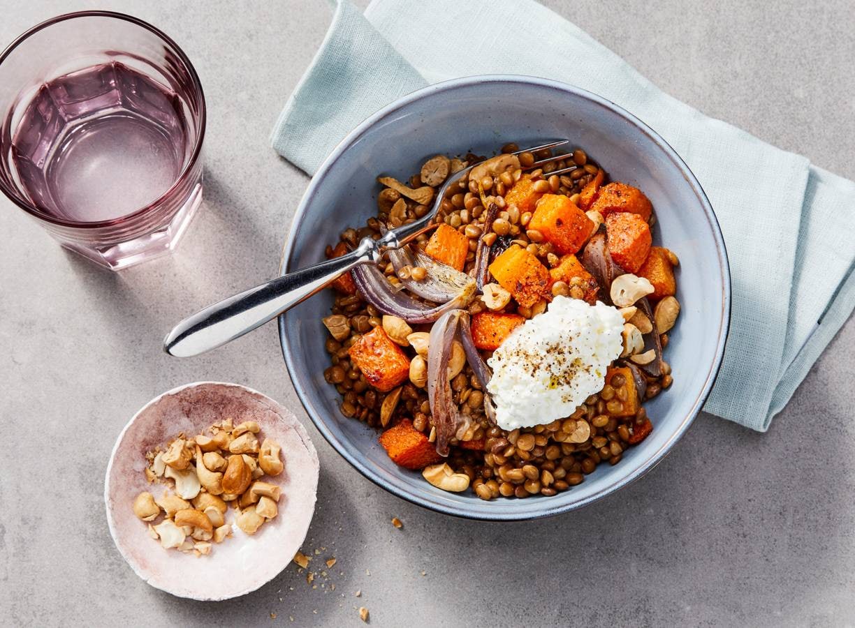 Linzensalade met geroosterde pompoen, rode ui en cottagecheese