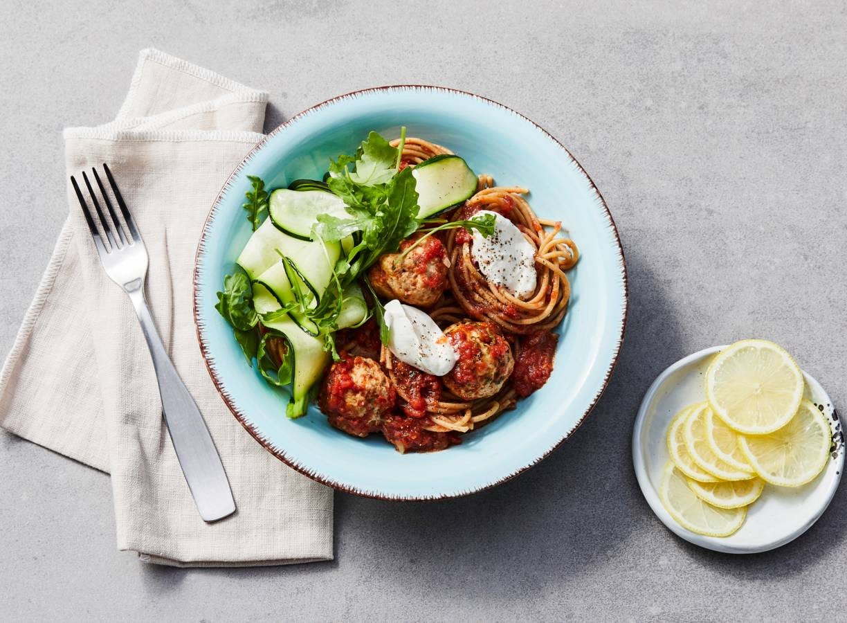 Volkoren spaghetti met kipgehaktballetjes in tomatensaus en courgette