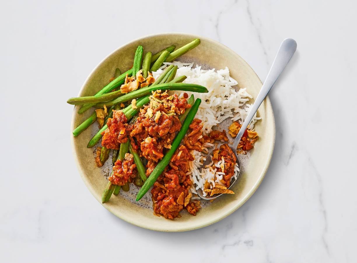 Gebakken sperziebonen en kruidig gehakt met witte rijst