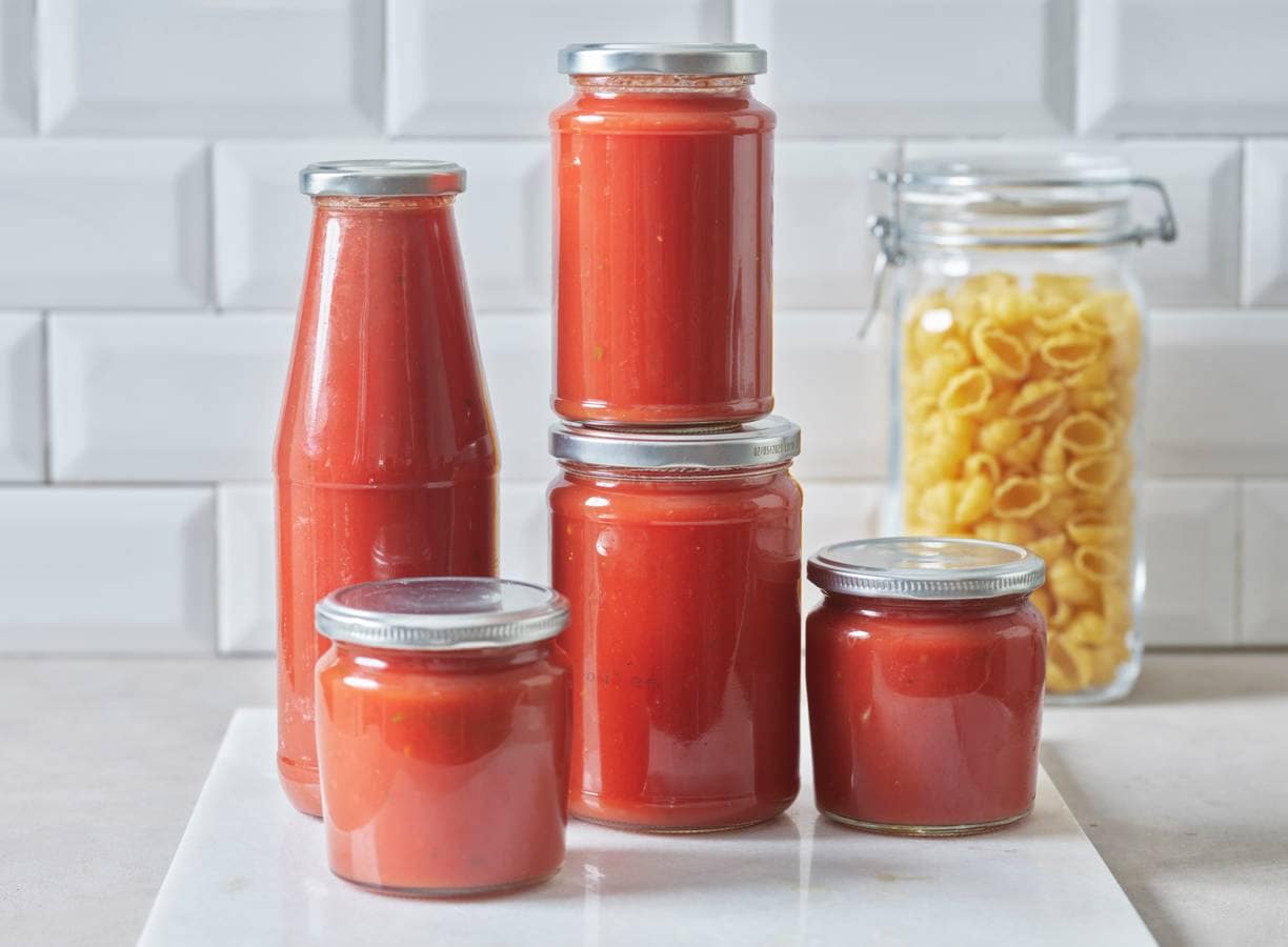 Leg in elke pot 1 blaadje basilicum. Schep de hete passata in de potten (of schenk erin met een wijde trechter), vul de potten tot de rand. Dek af met de deksel en keer direct om. Laat de potten omgekeerd minstens 24 uur afkoelen.