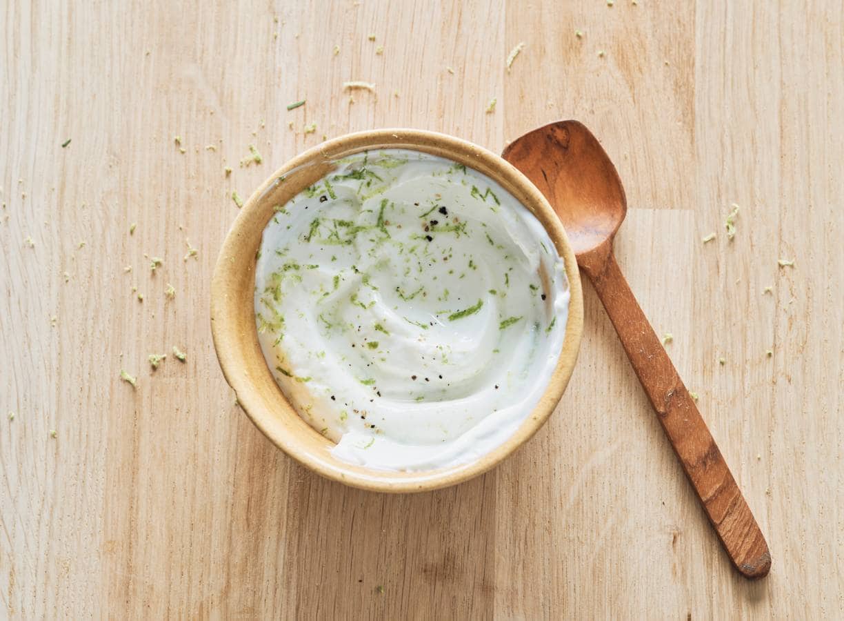 Boen de limoen schoon, rasp de groene schil en pers de vrucht uit. Roer de yoghurt los en meng er het limoenrasp, 1 el limoensap (per 4 personen) en het knoflookpoeder door. Breng op smaak met zout en peper.