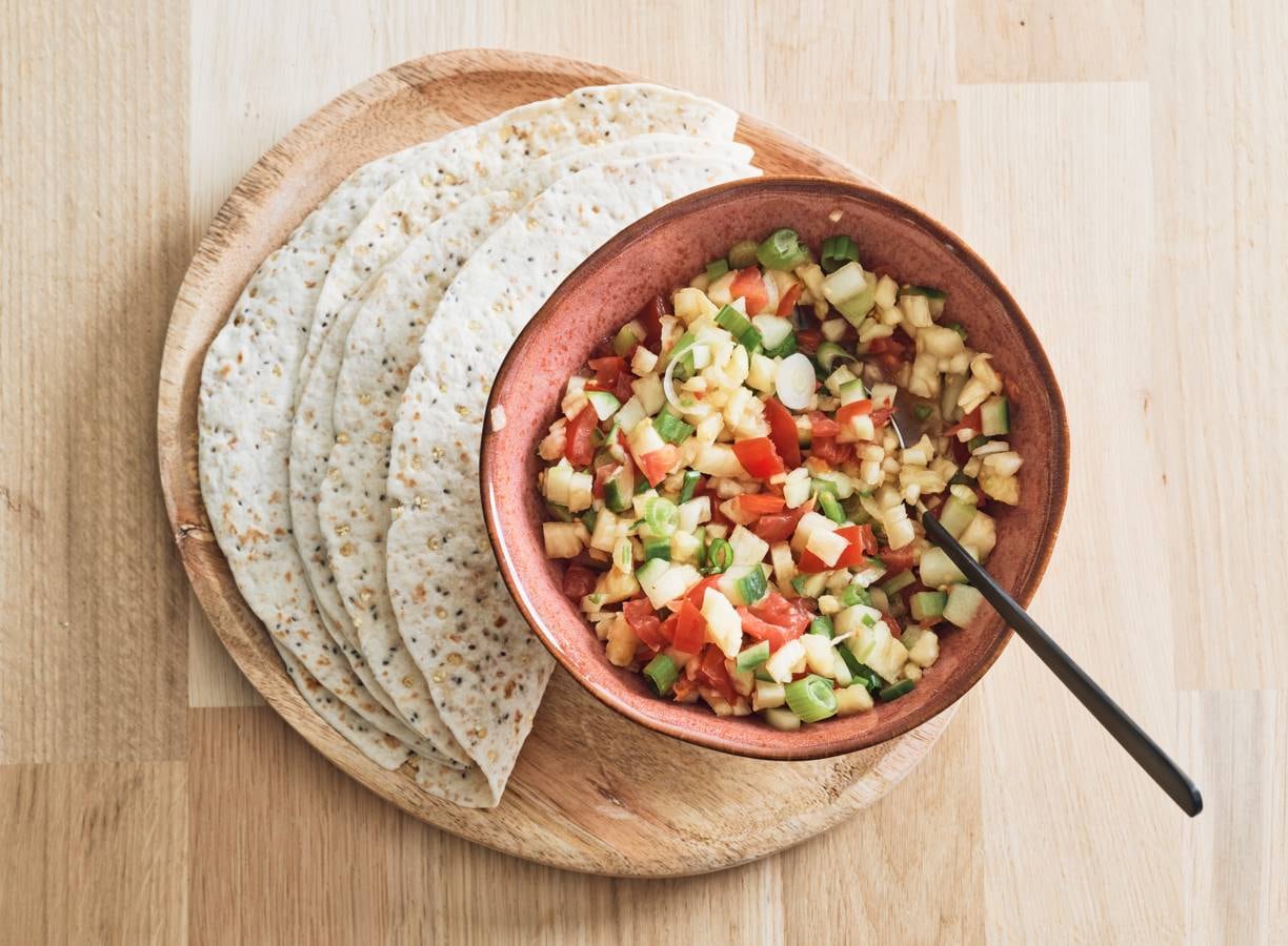 Exotische tomatensalsa! Deze variant bevat ananas en jalapeño: fris, zoet, zuur, en pittig. Lekker als topping bij een wrap of taco.