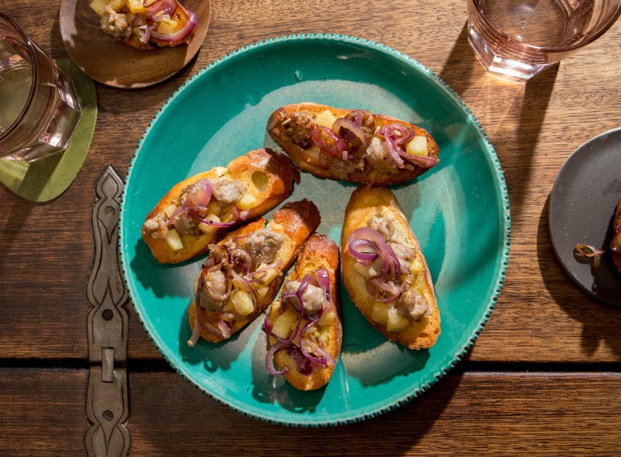 Beleg je stokbrood-hapjes eens met gebakken appel en (vega)worst. Een echt smaakbommetje.