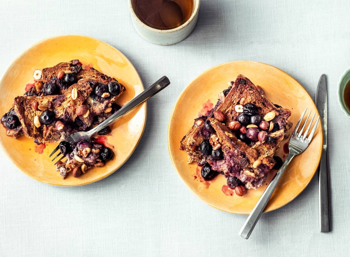 Snijd de sneetjes brood diagonaal doormidden. Leg de helft van de sneetjes in een laag in de ovenschaal en giet de helft van het eimengsel erover. Bestrooi met de helft van de blauwe bessen en de helft van de studentenhaver. Leg de rest van de sneetjes brood in een laag erop en giet de rest van het eimengsel erover.