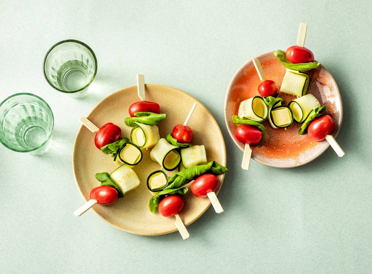 Courgettespiesjes met kaas, cherrytomaat en basillicum