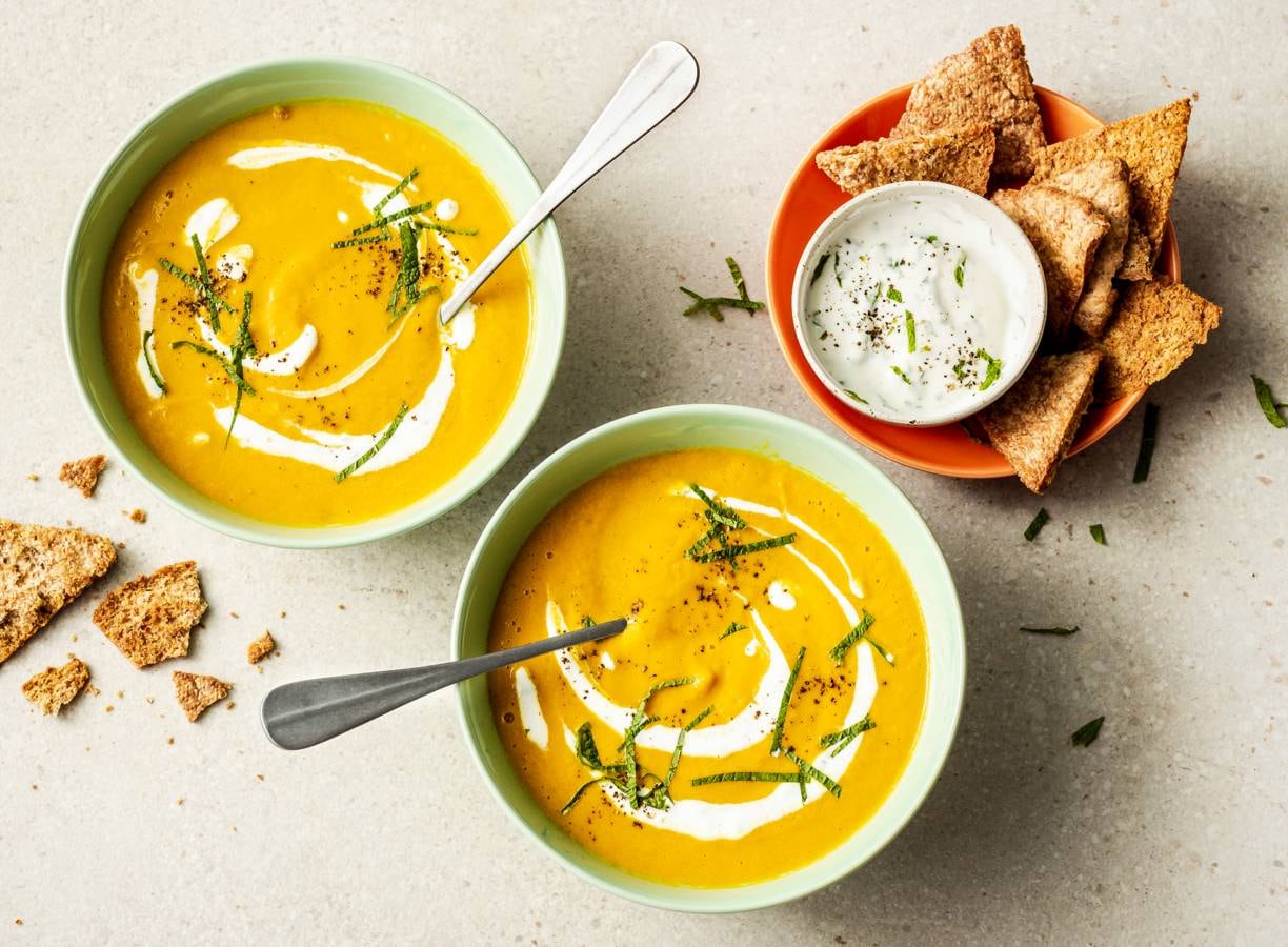 Neem de soeppan van het vuur en pureer de soep met de staafmixer. Verdeel de soep over diepe kommen. Schep in elke kom 1 el muntyoghurt en vorm met behulp van een theelepel een mooie swirl. Bestrooi met de rest van de munt en breng op smaak met peper. Serveer de soep met de pitapuntjes en de rest van de muntyoghurt.