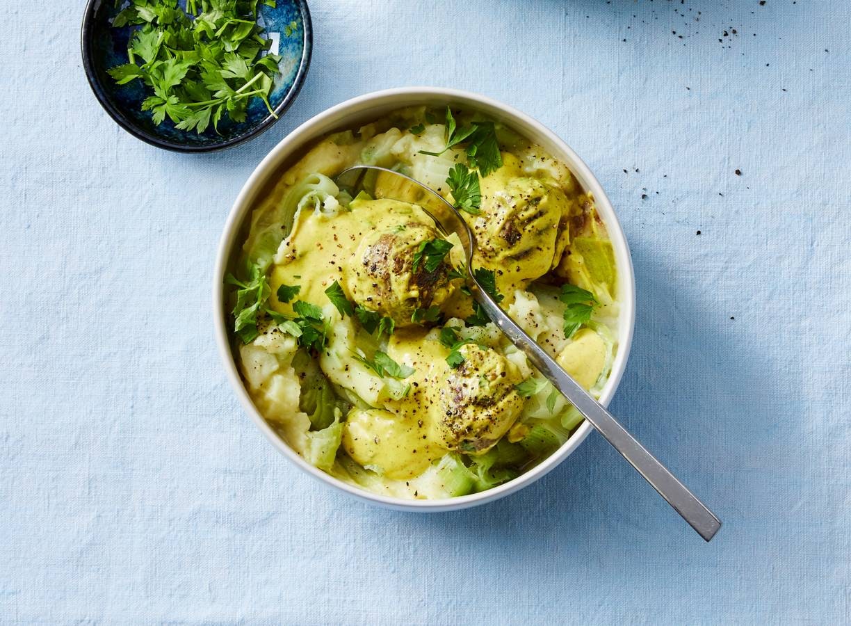 Preistamppot met runderballetjes in kerriesaus