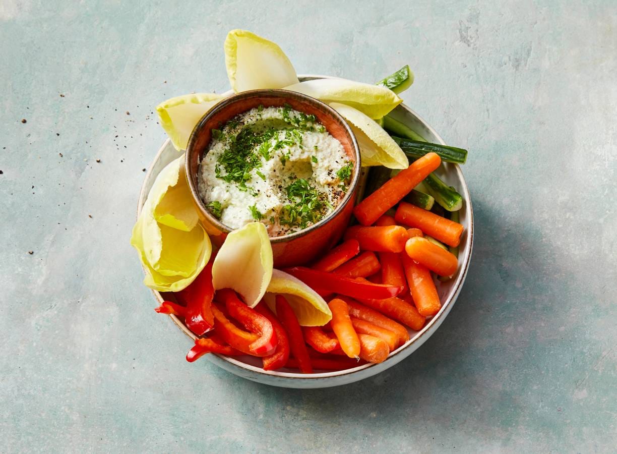 Romige bloemkooldip met snoepgroente en witlof