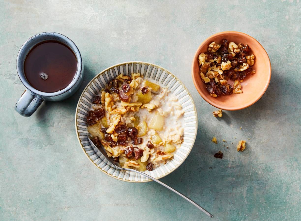 Havermout met peer, dadels en walnoten
