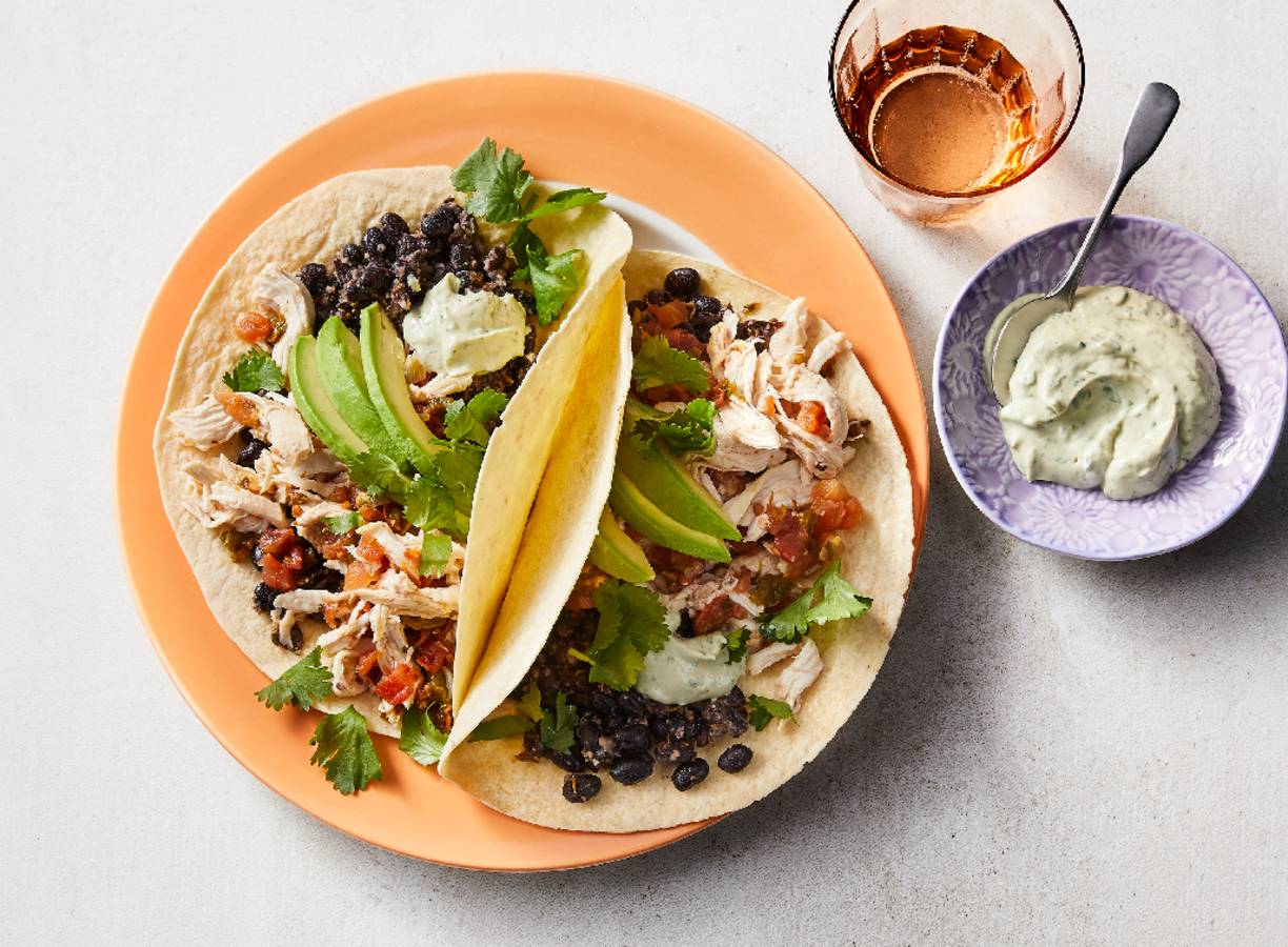 Schep het vruchtvlees uit de andere avocado en snijd in dunne plakjes. Verwarm 8 maistortilla’s volgens de aanwijzingen op de verpakking. Verdeel de kip, bonen, plakjes avocado en avocadosaus over de tortilla’s. Schep de rest van de salsa erop en verdeel de koriander erover.