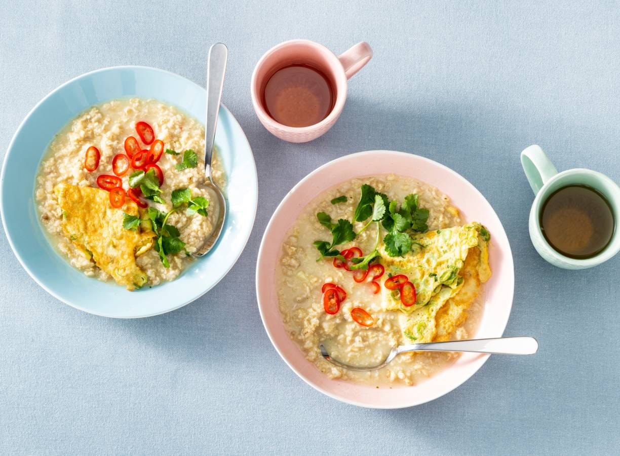 Top deze hartige havermout af met een omelet voor een stevig en smaakvol ontbijt. Dat houd je de hele ochtend zoet (of hartig?).