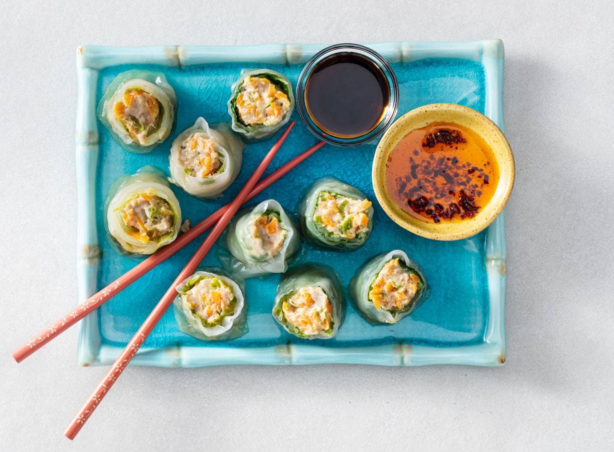 Maak dumplings van rijstvellen en vul ze met Chinese kool en kip. Extra lekker: serveer ze met maar liefst twee dips!