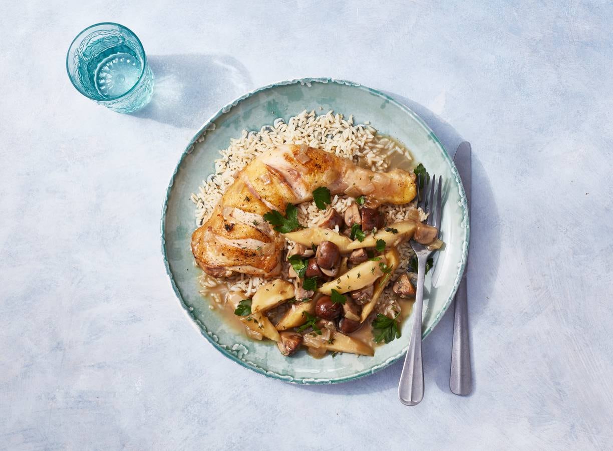 Gestoofde kippenpoten met champignons, pastinaak en volkoren rijst