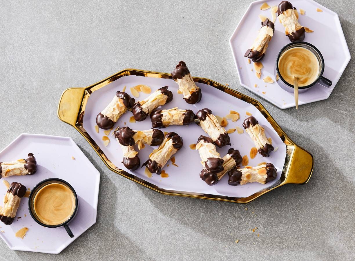 Spuit op twee met bakpapier beklede bakplaten koekjes van ca. 5 cm lang. Bestrooi ze met de geschaafde amandelen en bak ze in het midden van de oven in ca. 16 min. lichtbruin. Haal ze uit de oven en laat ze 30 min afkoelen.
