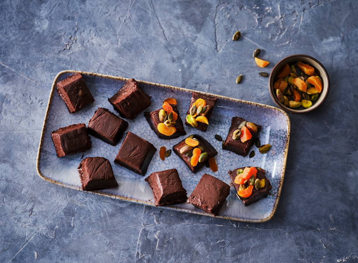 bewaartip:De chocoladefudge blijft een week goed in de koelkast.