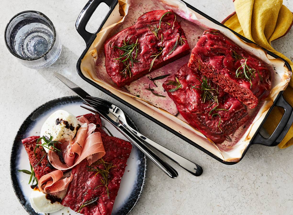 - serveertipHalveer de focaccia horizontaal en beleg als sandwich met buffelmozzarella, parmaham en balsamicoazijn. Of beleg vegetarisch met whipped feta (zie recept op ah.nl), gekookte bietjes in plakjes en wat balsamicoazijn. Het recept is dan niet meer vegan.