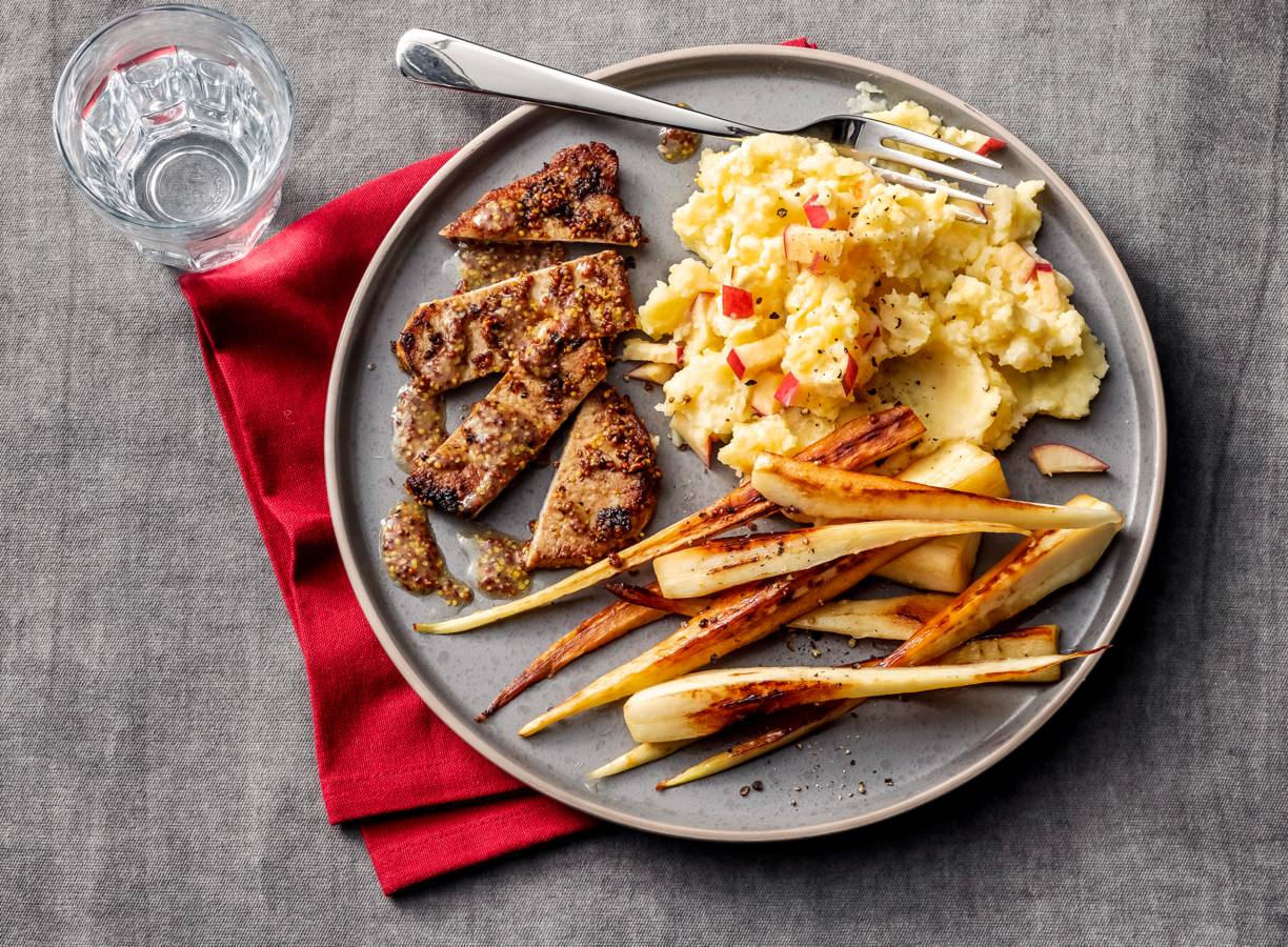 Varkensfilet met appel-aardappelstamp en geroosterde pastinaak