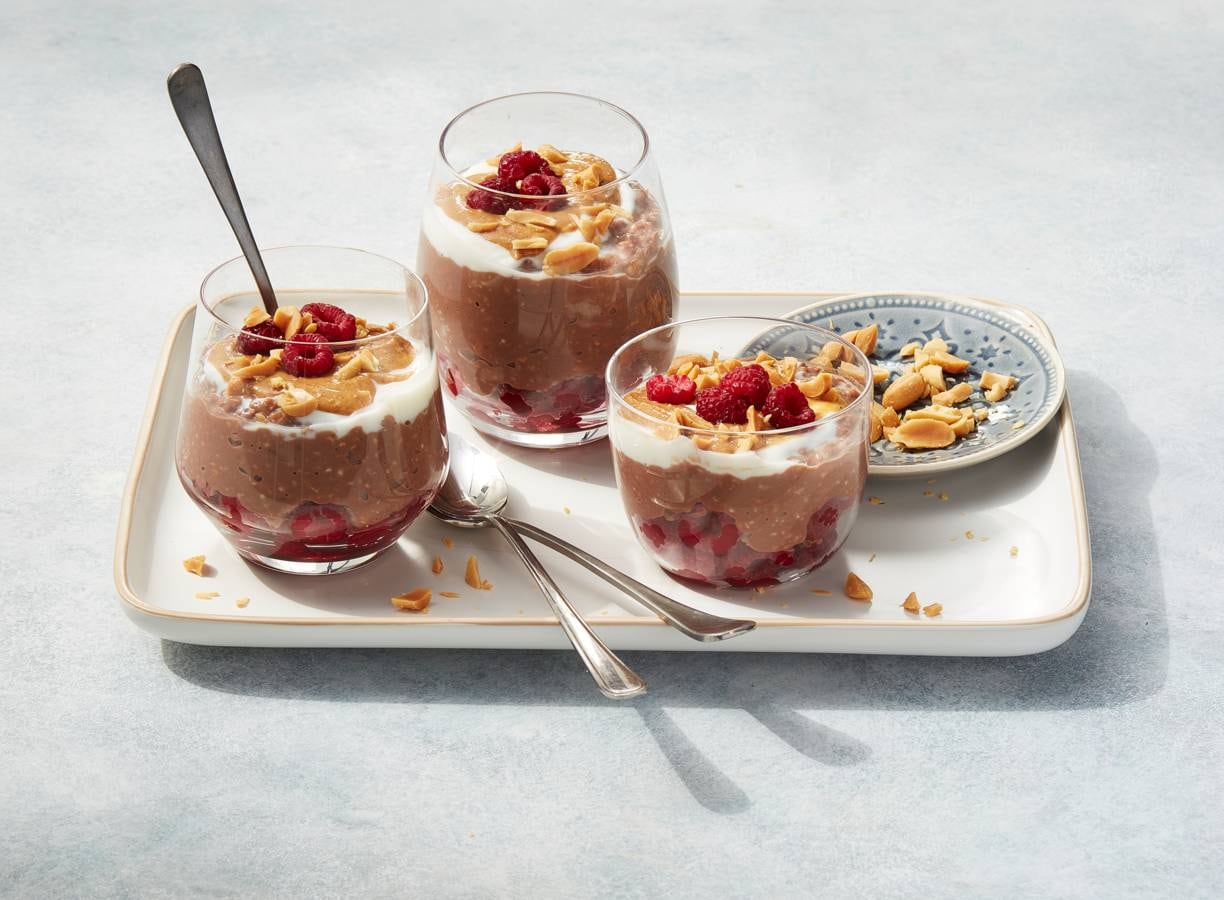 Laat de frambozen ontdooien. Meng de chocoladedrink met de havermout en ⅔ van de yoghurt. Verdeel ⅘ van de frambozen over 4 potjes of glazen. Schep daar voorzichtig de chocolade-havermout op. Dek de potjes af met vershoudfolie of een deksel en laat een nacht in de koelkast staan.
