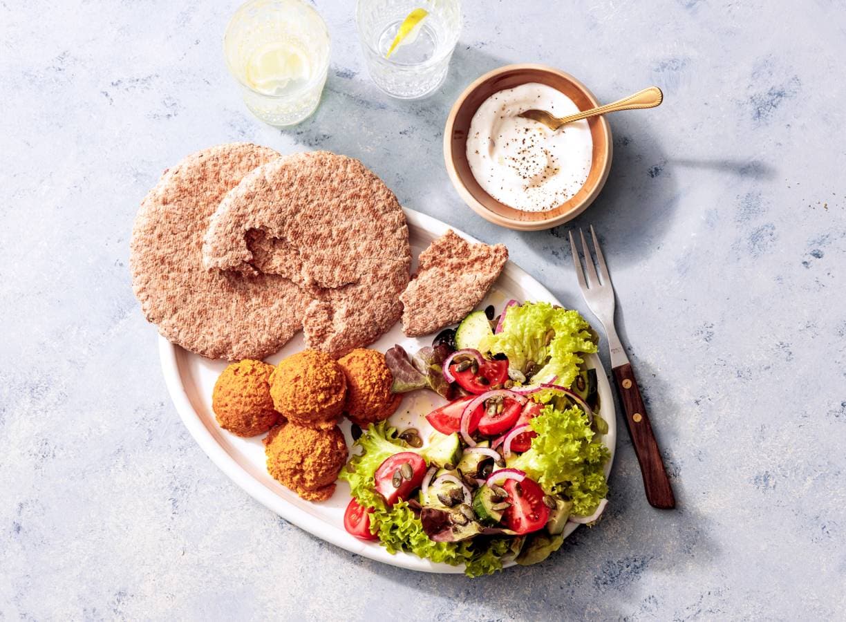 Cannellinibonen-wortelballetjes met kurkuma, pitabrood en Griekse salade