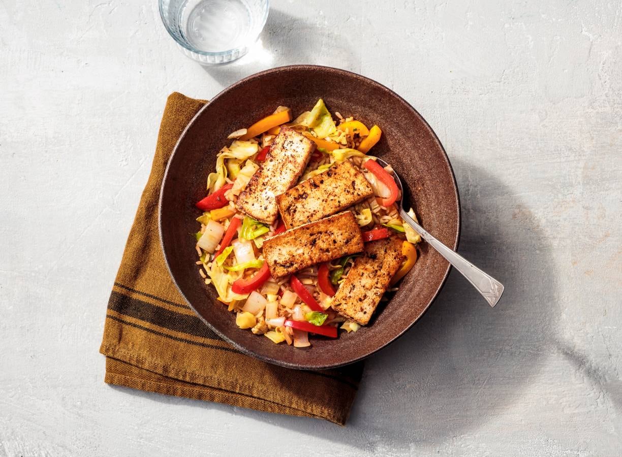 Rijstroerbak met spitskool, paprika en tex-mex tofu