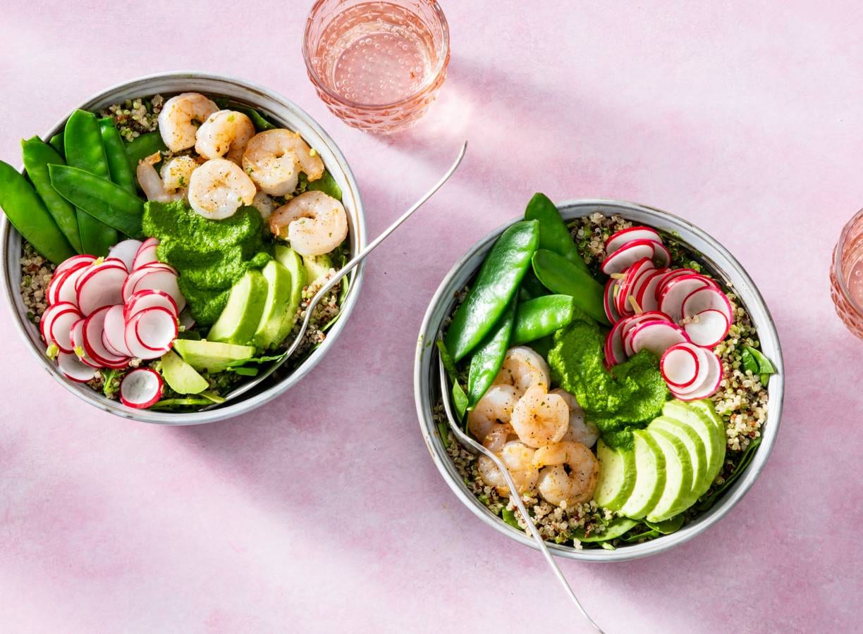 Garnalen-quinoabowl met spinazie, peultjes en avocado