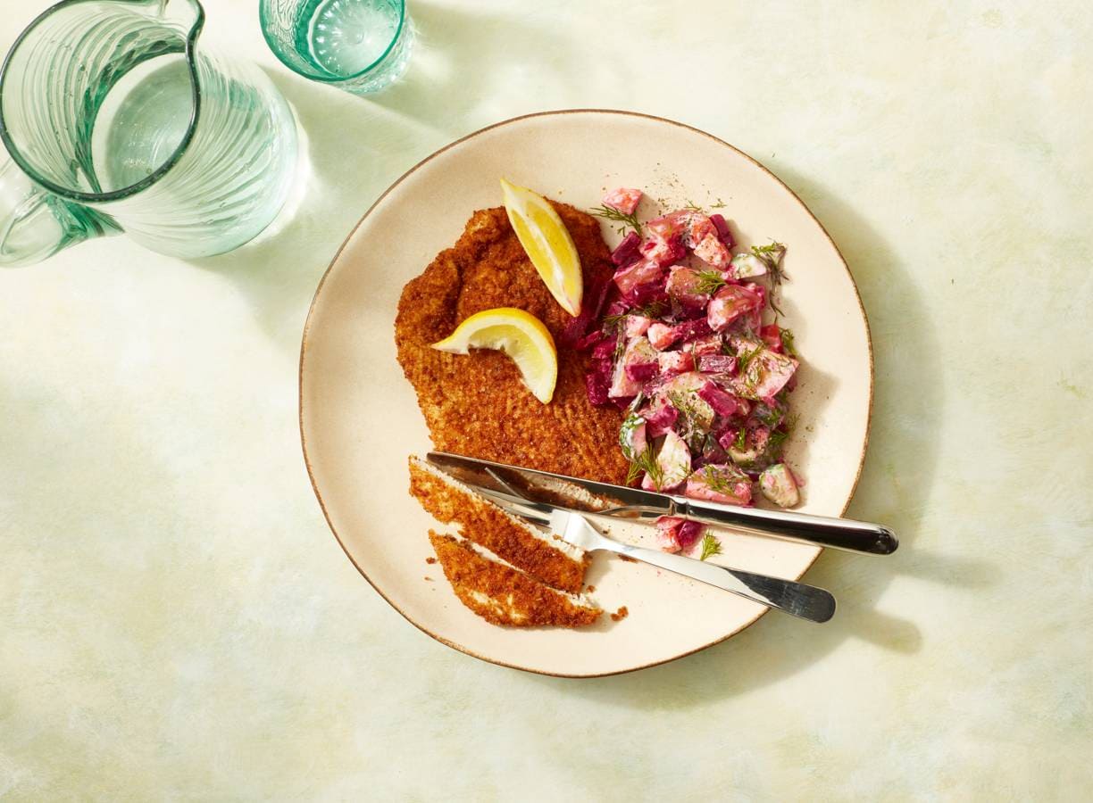 Gezonde schnitzel met bieten-aardappelsalade