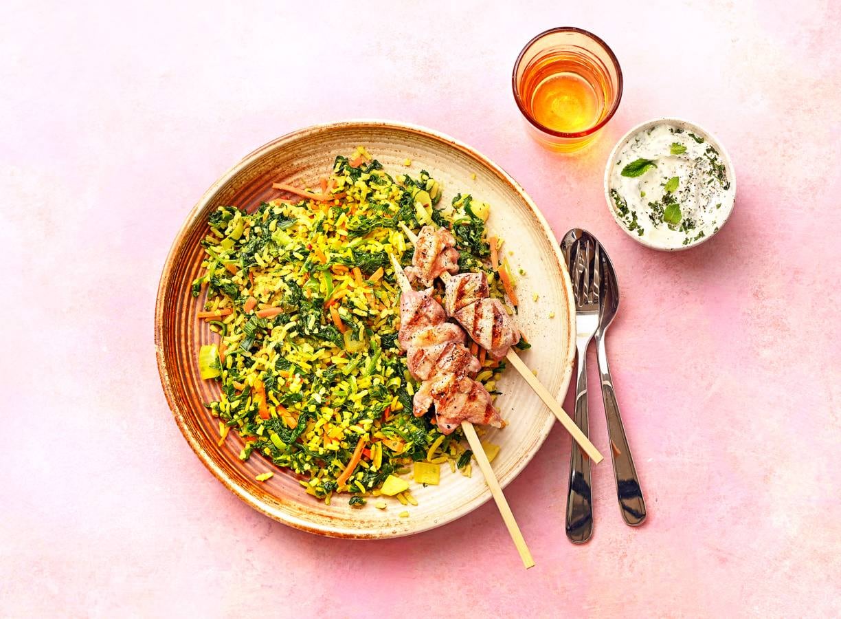 Karbonadespiesjes met roergebakken curryrijst en soepgroente