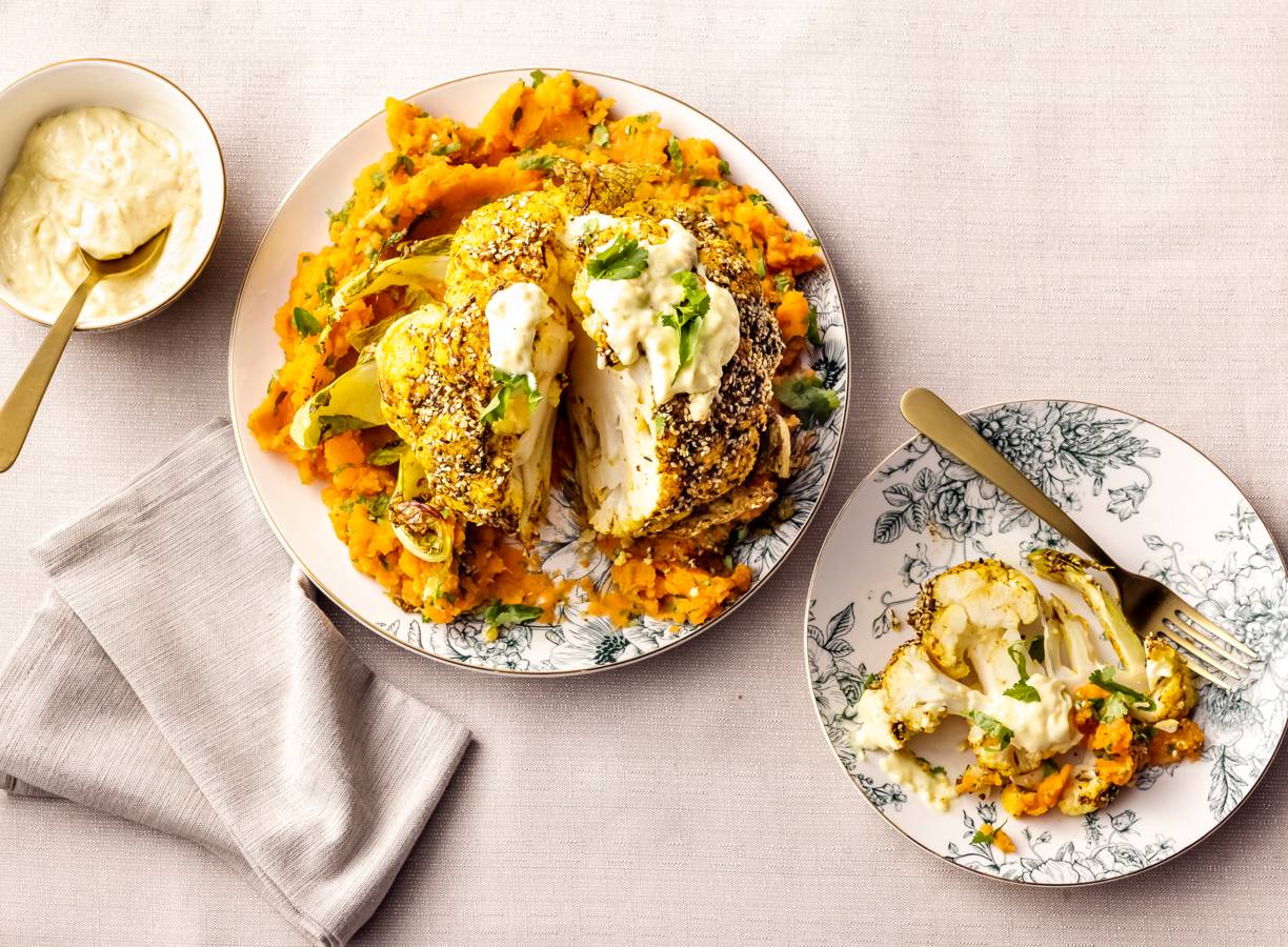 Bloemkool uit de oven: als je 'm in z'n geheel roostert en opmaakt met sesam, heb je een mooi vega-pronkstuk op tafel.