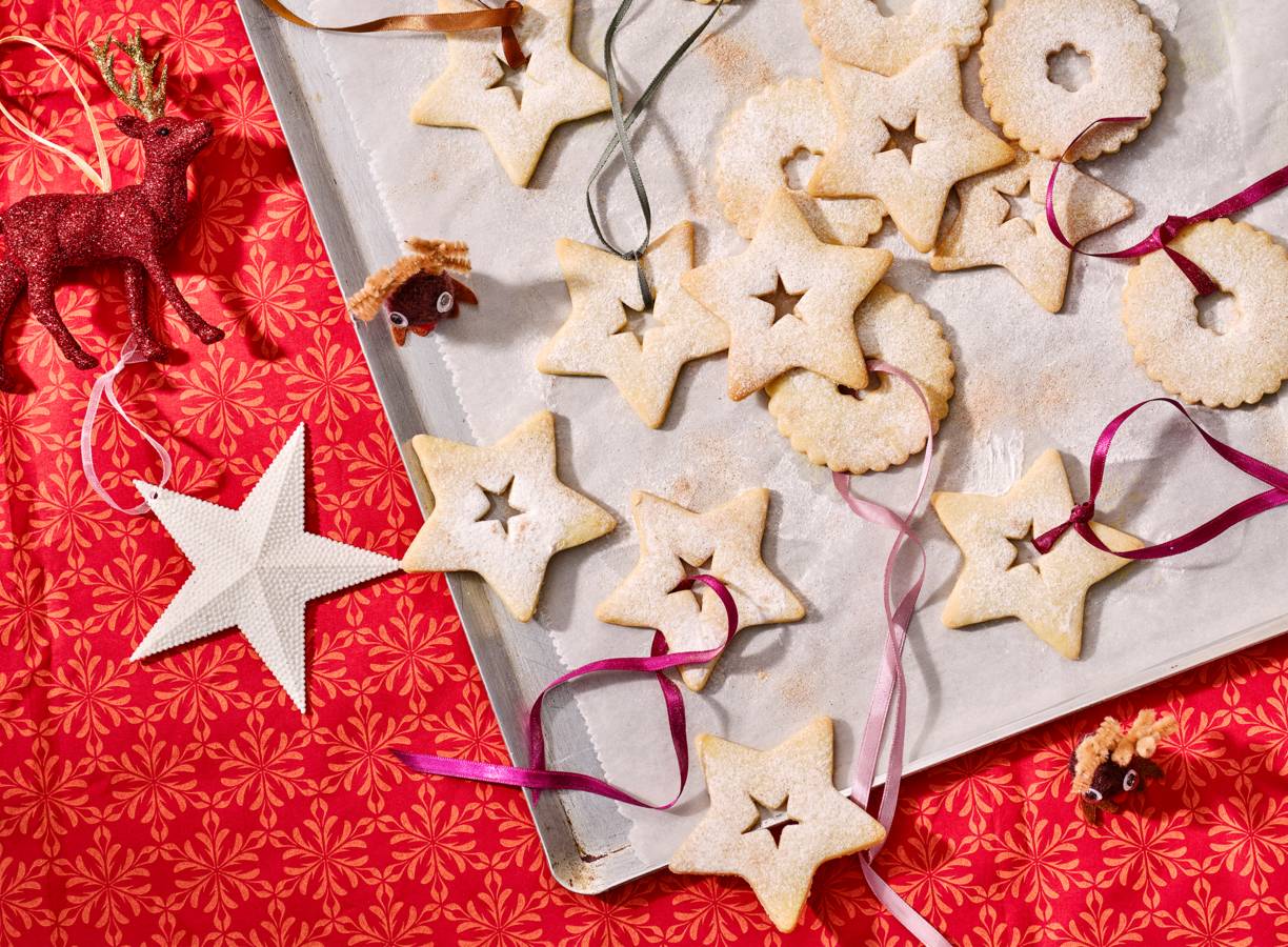 Verwarm de oven voor op 165 °C. Neem de rol uit de koelkast en snijd in 20 plakken (per 20 porties) van ca. 1.5 cm dik (per 20 stuks). Rol elk plakje uit tot en snijd er sterren en kransjes uit met uitsteekvormpjes. Leg ze op een met bakpapier beklede bakplaat en bak ca. 15 min. in de oven. Let op dat ze niet bruin worden.
