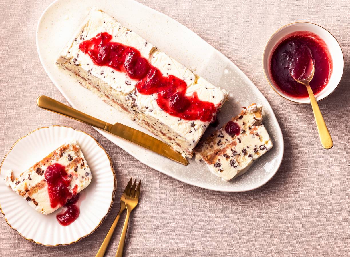 IJstaart x cranberrysaus... veel kerstiger wordt het niet. Plus, de taart kun je makkelijk van tevoren al klaarmaken.