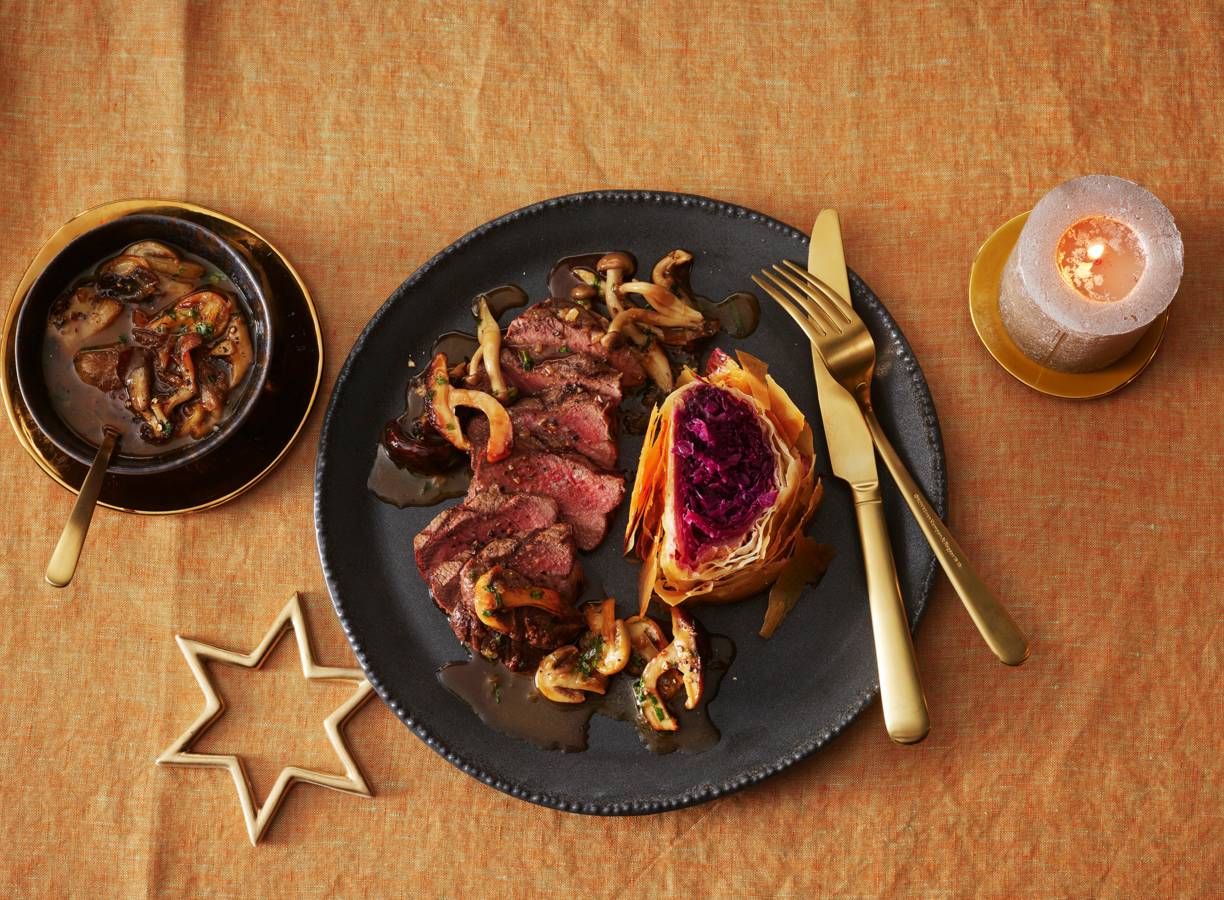 7. Snijd de strudel in dikke plakken, snijd de hertenfilets in dunne plakken (trancheren) en serveer met de bier-paddosaus.