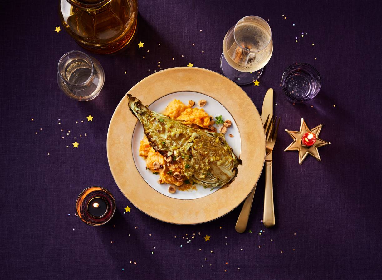 Van gember, sojasaus en balsamico maak je een mooie marinade voor over de spitskool. Samen met de romige pompoenpuree en geroosterde hazelnoten is dit een echte vega-topper!