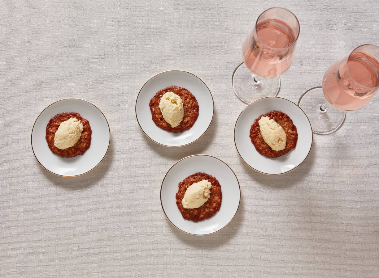 Leg de kletskoppen op de bordjes. Doop 2 ovale eetlepels in een bakje heet water. Maak met de warme lepels quenelles van de mousse en leg op elke kletskop een quenelle.