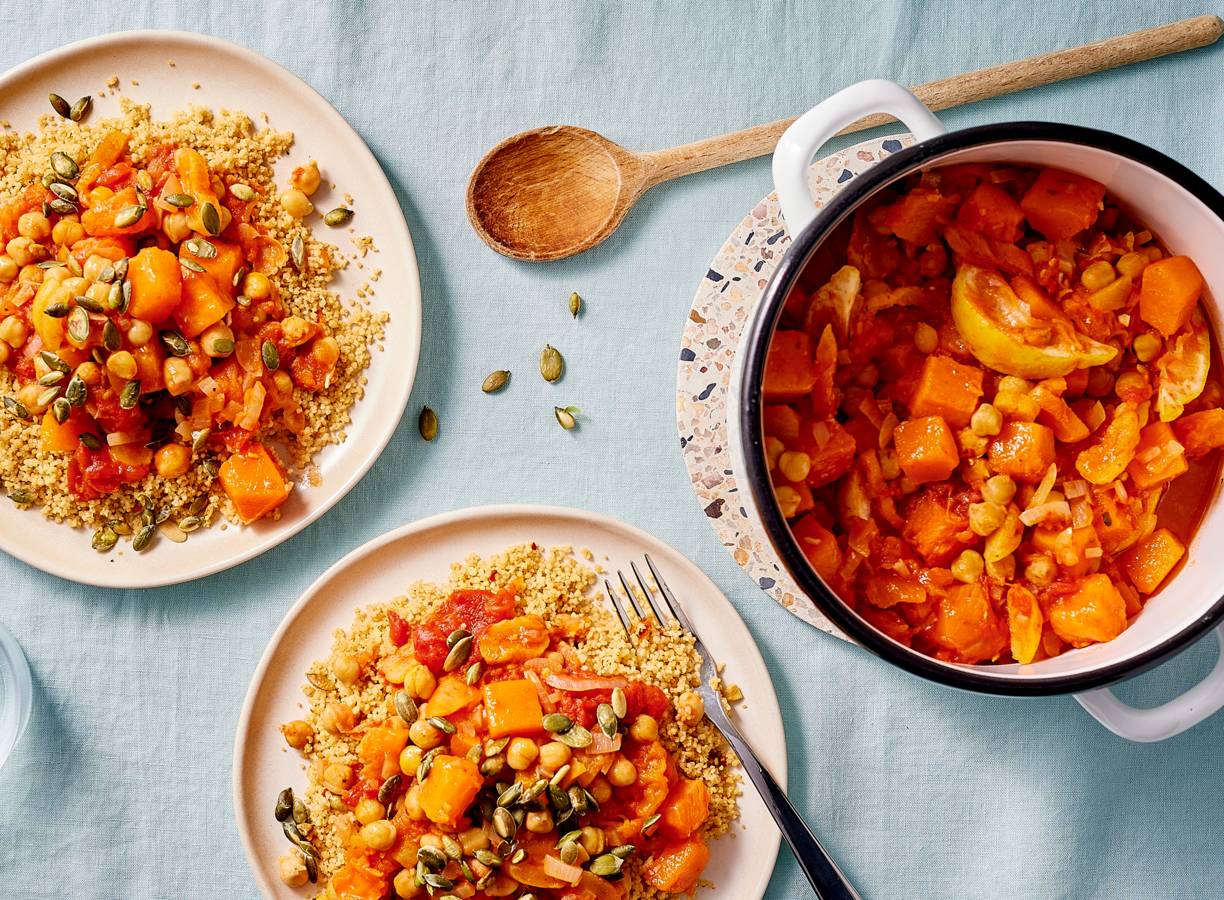 Roer de couscous los, meng met de rest van de olie en serveer met de pompoen-kikkererwtenstoof. Bestrooi met de pompoenpitten. De partjes citroen eet je niet op.