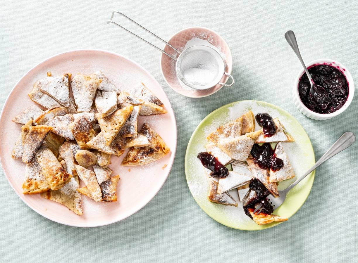 Snijd de pannenkoeken in vieren en keer ze om met behulp van een spatel. Verdeel de kwarten in kleinere stukjes. Bak nog 3 min. en keer regelmatig. Bestuif de kaiserschmarrn met de poedersuiker en serveer met de vruchtenspread.