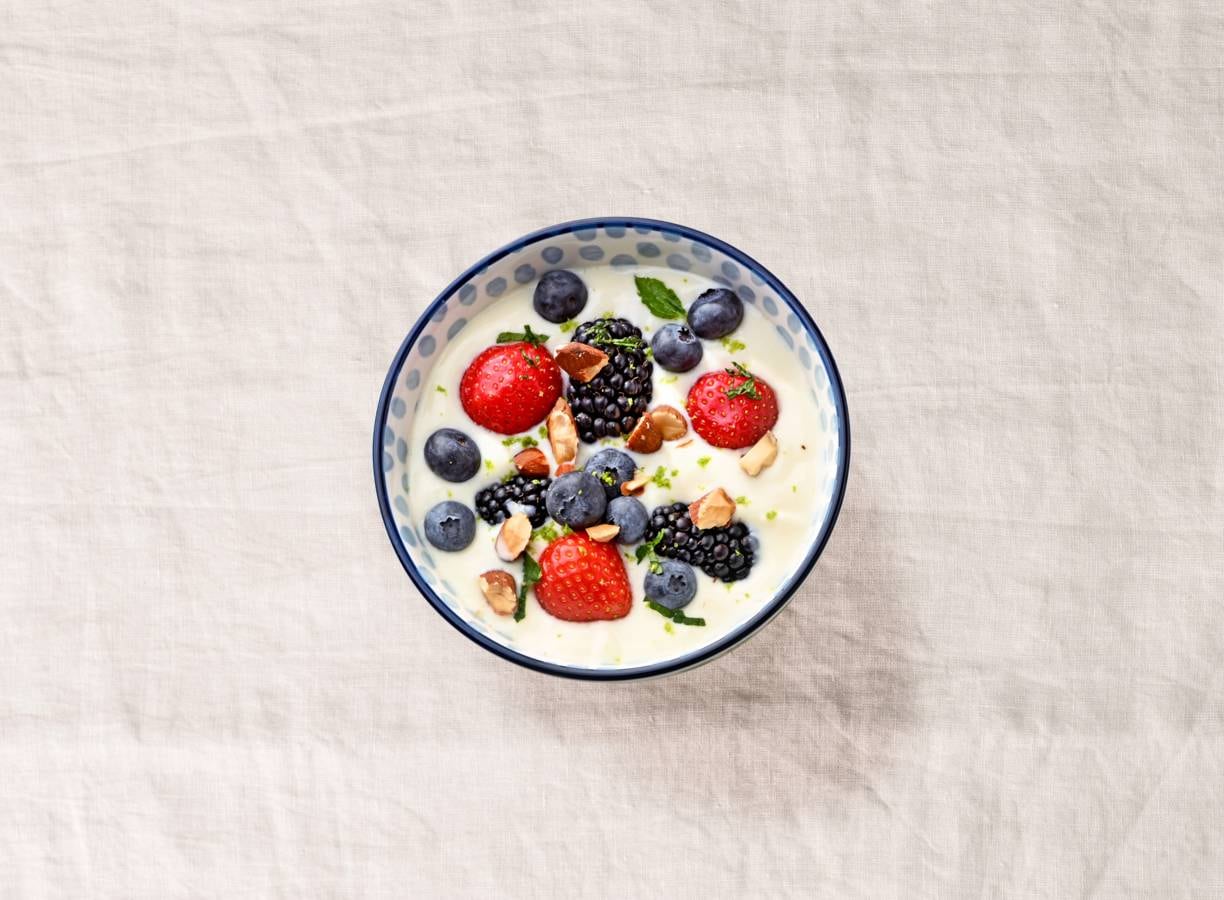 Snijd de blaadjes van het takje munt fijn en hak de amandelen grof. Boen de limoen schoon, rasp de groene schil en pers uit. Meng de verse aardbeien, bramen en blauwe bessen met het limoenrasp, -sap en de munt. Verdeel over de soja-gurt en bestrooi met de amandelen.