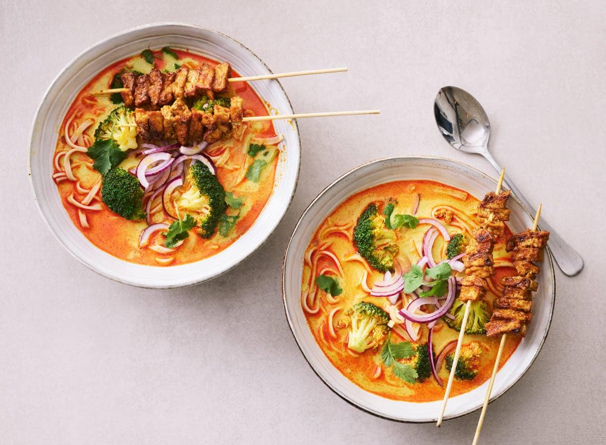 Gele-currysoep met broccoli en gegrilde tofuspiesjes